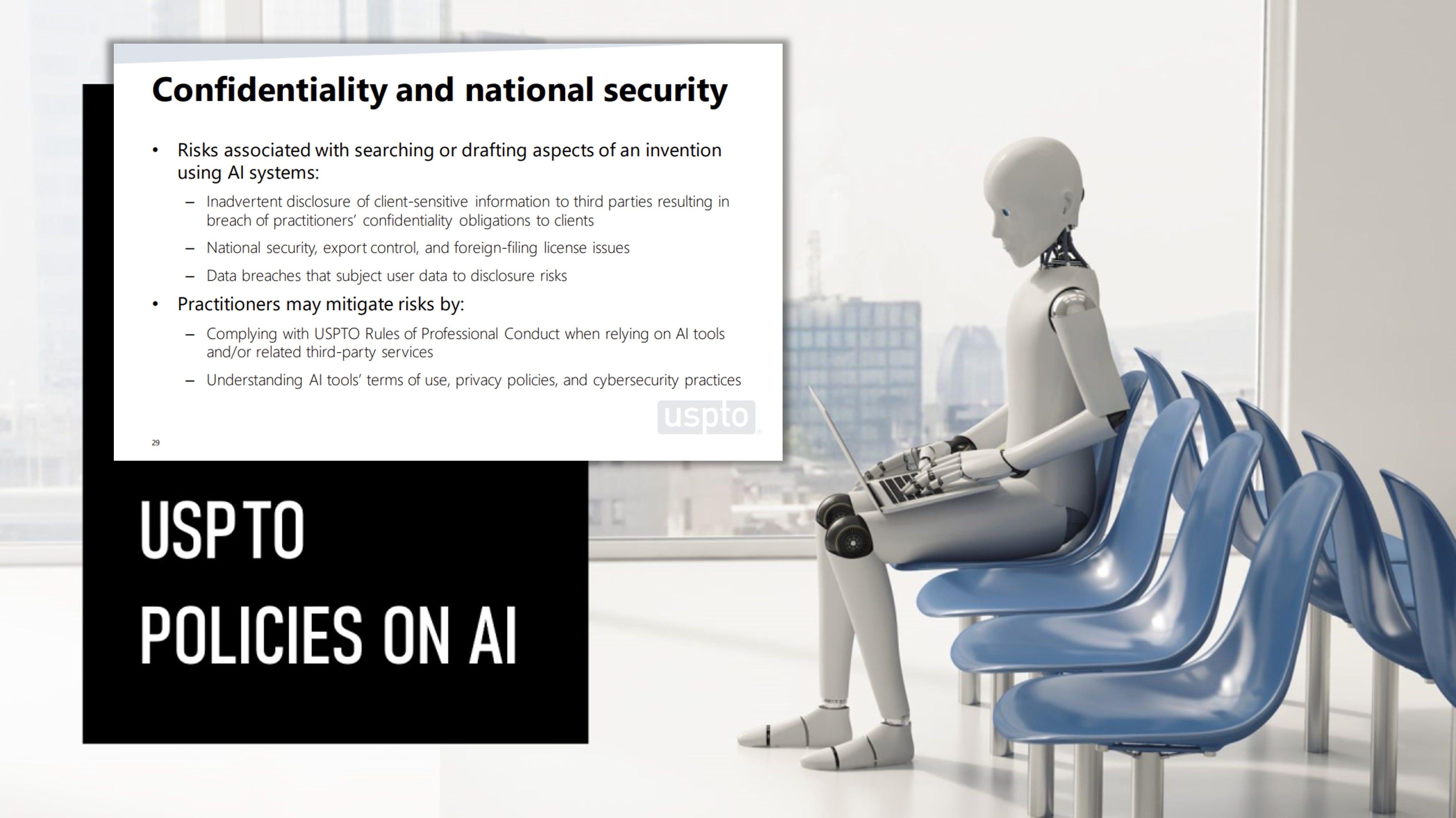 The USPTO itself has touched upon these confidentiality concerns. In May 2024, Nalini Mummalaneni, Senior Legal Advisor, highlighted several key areas:
